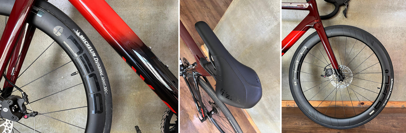 The Michelin Dynamic Sport 7x25C slick tires on the J-Air Fuoco 15 are race specific tires built to be lightweight and reliable. These tires make sure it gives maximum traction on dry and wet tarmacs. They are well supported by lightweight deep-dish Decaf rims.The Saddle was not only stylish, but has a level of support and cushioning that suits the rider on faster rides just as much as long distance rides. The integrated seat post clamp was shaped aerodynamically. “The Michelin Dynamic Sport 7x25C slick tires on the J-Air Fuoco 15 are race specific tires built to be lightweight and reliable. These tires make sure it gives maximum traction on dry and wet tarmacs. They are well supported by lightweight deep-dish Decaf rims.The Saddle was not only stylish, but has a level of support and cushioning that suits the rider on faster rides just as much as long distance rides. The integrated seat post clamp was shaped aerodynamically.