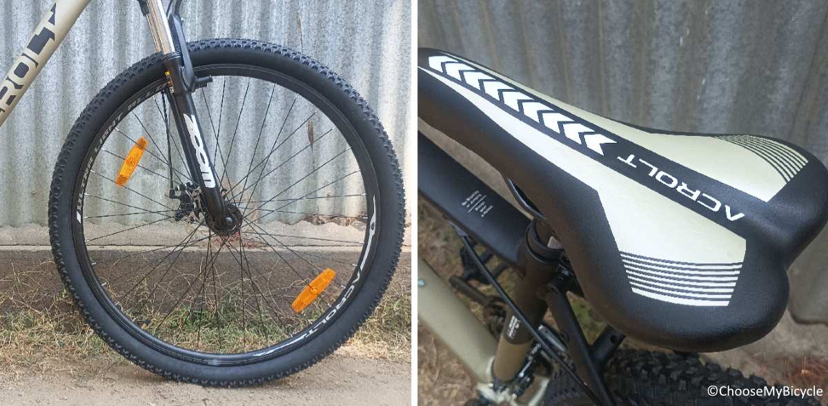 The Acrolt Hyper Pro 29 comes with DSI 29” x 2.2” MTB tires. These tires have bulky treads and a uniform tread pattern which provided great traction on trails and flat muddy surfaces. The wheel set provided a faster rolling resistance as well as a balanced ride on flat trails.The stock saddle from Acrolt is ergonomic in design with enough cushioning for a soreness free ride.