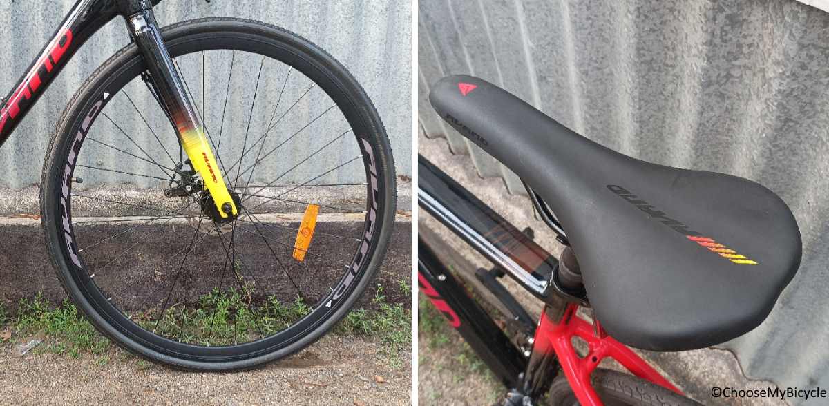 The Avand Vector comes equipped with fast rolling and sleek Kenda Kwest 7x28C tires which are attached to Alloy double walled rims. The tires offered a smooth and fast ride. Cornering felt stable, allowing for crisp sharp turns while being stable.This Bicycle comes equipped with a stock road specific saddle. The saddle offered a level of support and cushioning that is well suited to a rider on short-distance and long rides.