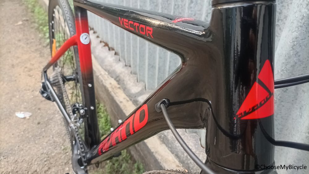 The Avand Vector is a well-designed Bicycle. The smooth welding of the frame joints adds to the overall aesthetics of this Bicycle. The Bicycle we test rode came in a primary colour Titanium Black with minimal Red decals. The branding on the frame of this Bicycle is significant while not being overpowering. The thin tubes made the Bicycle look sleek.