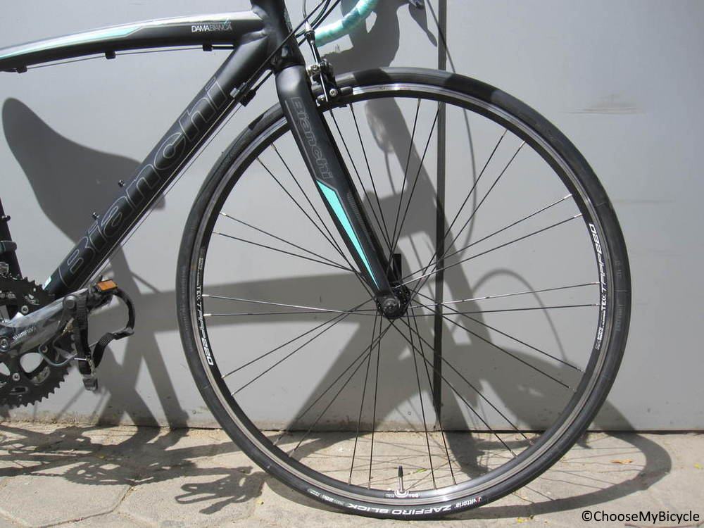 The Bianchi Via Nirone 7 Dama Bianca (Claris)217 comes equipped with a Shimano Claris drive train. The front derailleur is the Shimano Claris FD-24, 2-Speed along with the Shimano Claris RD-24, 8-Speed. The shifting is controlled by Shimano Claris shifters, which are extremely precise and responsive. When on the test ride, I found the shifting to be impeccably concise and the shifters required a feather light touch to engage the gears. Overall, very impressive.