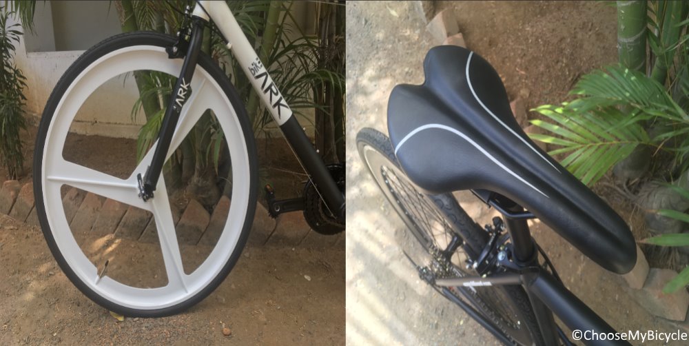 Bike Ark has always been on point with their design, since their very first fixed bicycle models to their hybrids from 218. It's safe to say the Mag-Alloy wheels were the stand-out feature on the design front on Bike Ark. The Daz hybrid is one of the 3 hybrid models and it comes with a single mag-alloy wheel in the front. Apart from being extremely stylish the mag wheel could also contribute a bit it to the wheel being a bit aerodynamic. The Daz which I test rode came in a half and half Black/White on the bicycle. The matte finish paint job was smooth and neatly done.