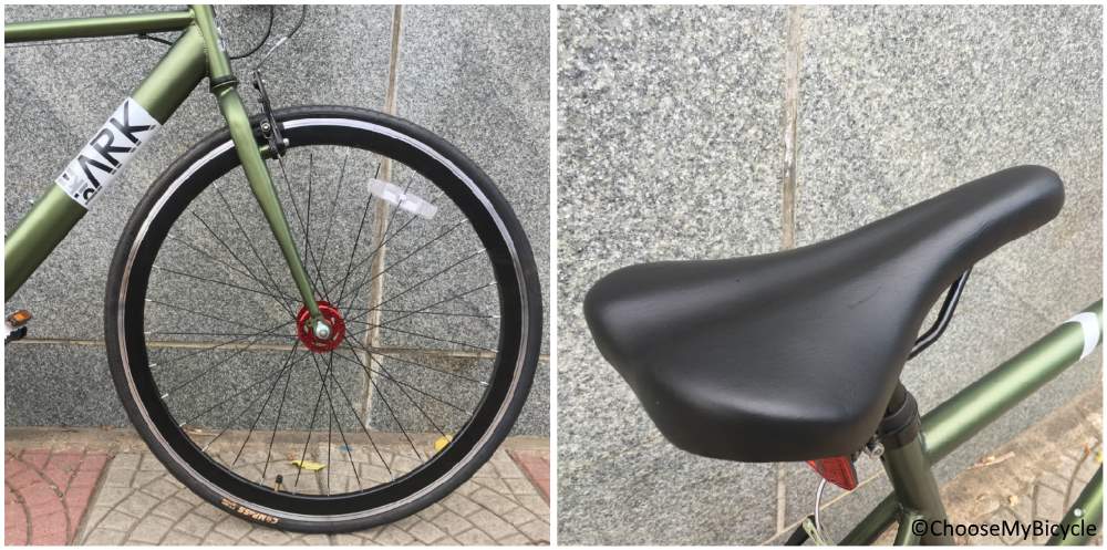 The Compass 7x28c tires at the front and rear were fast rolling and perfect for urban commuting. These lightweight wheels with double walled alloy rims and magnesium tri-spoke alloy contributed to keeping the overall bicycle weight at check. The ergonomically designed stock saddle from Bike Ark had the perfect width and cushioning for urban commuting and can handle slightly bumpy roads.