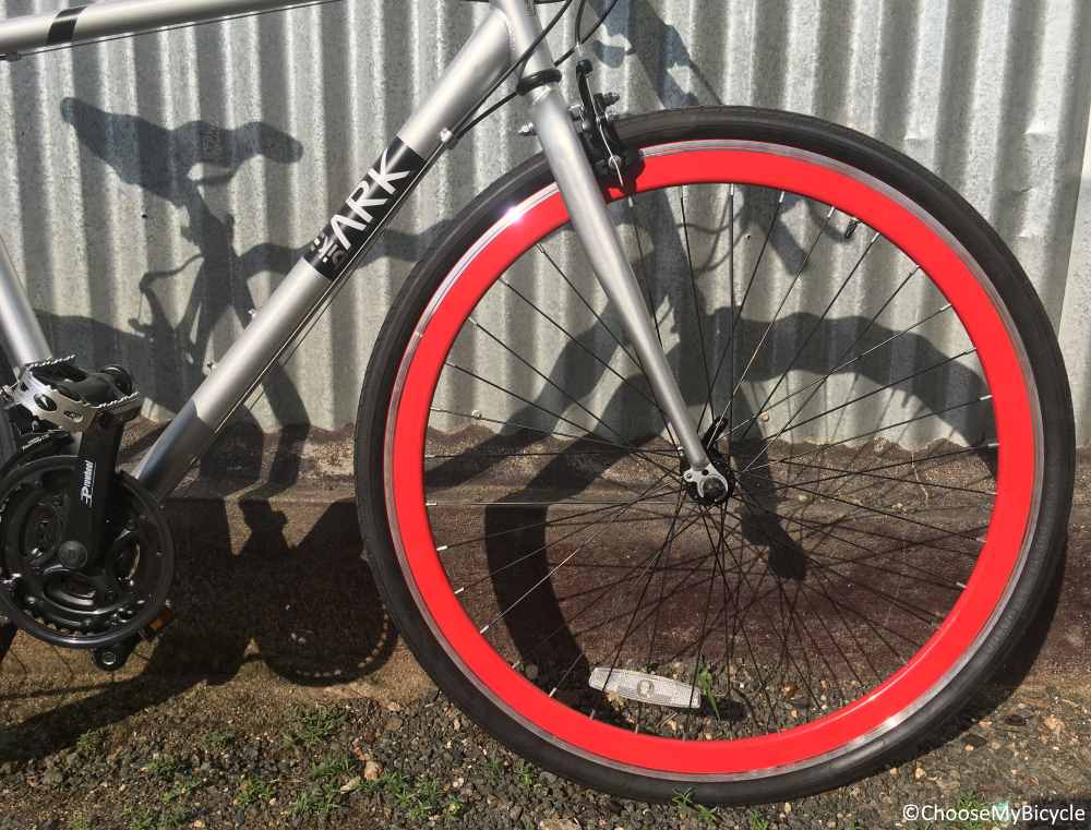 This is the department in which Bike Ark has always excelled in from the beginning. The Jaz Hybrid Bicycle which I test rode came in a full silver frame with a shining gloss finish and black graphics in a few places. The red deep dish rim on both wheels adds an enormous amount of aesthetic appeal to the Jaz.