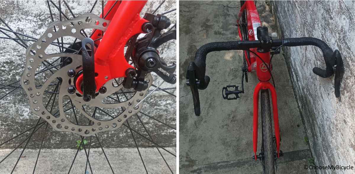 The Jemota branded Mechanical Disc brakes on the Bike Ark Vibe 7C SS Drop Bar were sufficient for all braking needs on flat tarmacs. The brakes felt balanced but could have been more powerful.The drop handlebar was wide enough to give great steering control and easy access to the brake levers.