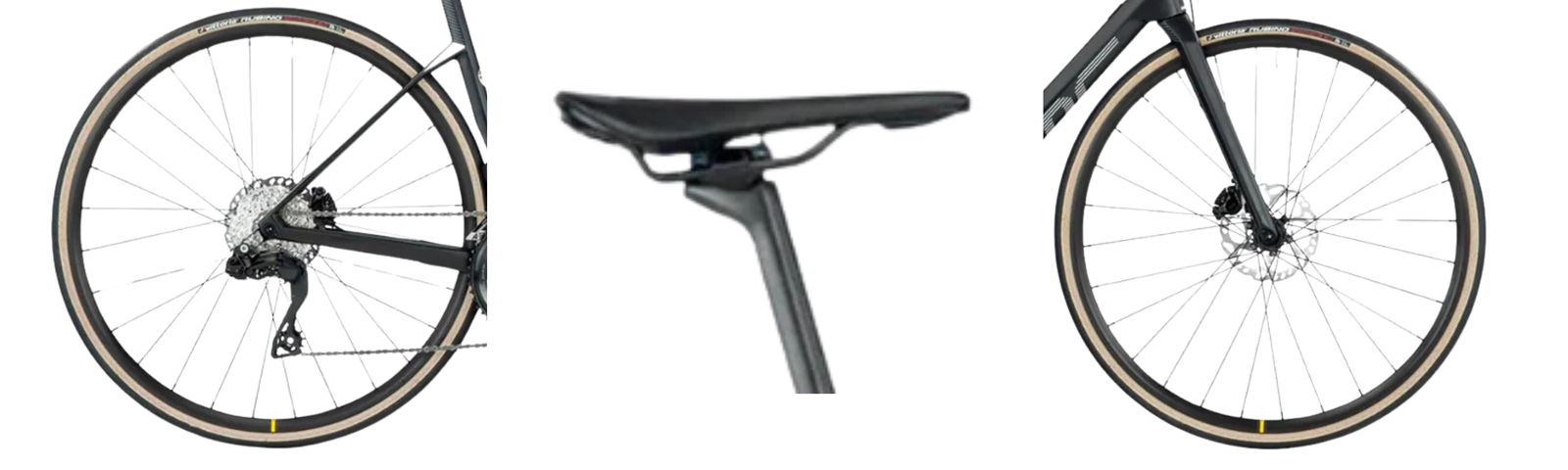 Mavic Open Disc wheelset ensures durability and smooth rolling. Vittoria Rubino tyres balance grip and efficiency. Lightweight rims improve acceleration. Thru-axle hubs increase wheel stiffness. Fizik Antares saddle enhances ergonomic comfort. Built for stable and efficient road riding.