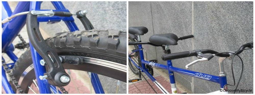 The Tandem Duo is equipped with V-brakes at the front and back. The Sypo branded brakes are same ones, which are used on the Mach City iBike range. These brakes worked well during the test ride when braking on both wet and dry surfaces. The long brake pads ensured the braking was smooth. Jamming of these brakes aren’t that effective but interval braking will get the job done. The rider at the front called the ‘Captain’ has complete control of the brakes.There are 2 handlebars on a tandem. One at the front in the usual place and the 2nd one for the ‘Stoker’ is right behind the ‘Captain's’ saddle. The 2nd handlebar's stem is attached to the front saddle's seat post. For taller riders this handlebar could feel a little low if the seat post of the Captain is kept at the minimum. The handlebar lengths for both were perfect for a comfortable riding posture.