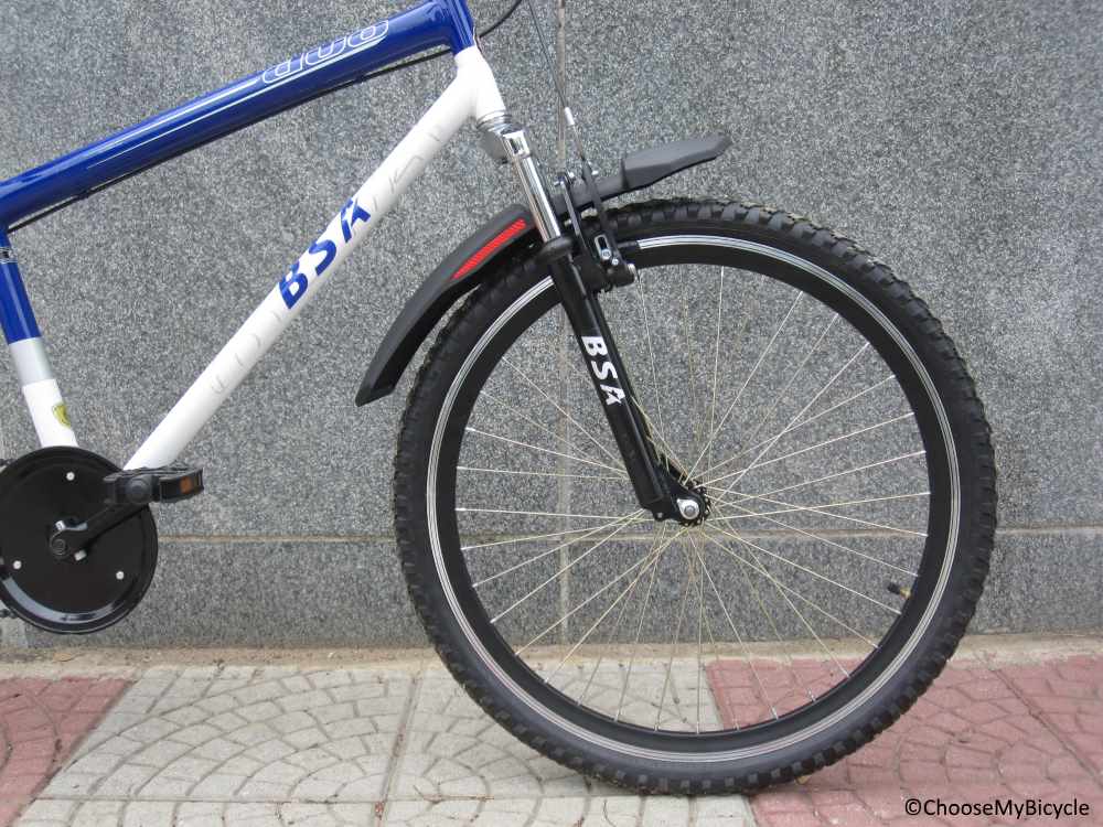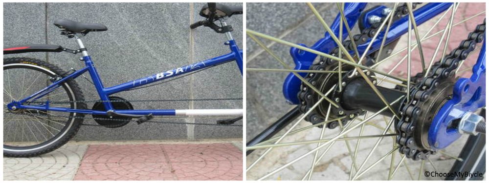 The frame of the BSA Tandem Duo is made of steel. The frame strength compensates for two riders and a substantial increase in power, so this frame has thick tubing and struts to reinforce both seat tubes and the front head tube. This heavy-duty frame has a slanting top tube, which makes it a step through frame. This makes it easier for women riders as well. The suspension on the Tandem Duo is a basic component just enough to tackle the smaller bumps and speed breakers. The rider at the back called the ‘Stoker’ will not benefit from this front suspension and will continue feeling the bumps of the surface which is generated from the back tire mainly.