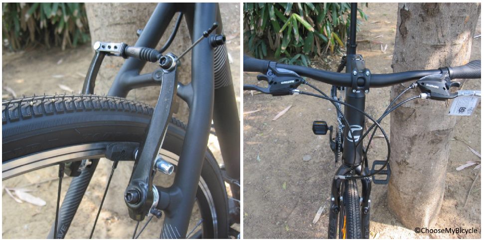 This hybrid bicycle's stopping power is controlled by Cannondale's stock V-brakes at the front and rear. With its long brake pads and arms these brakes are sufficient while riding through traffic on city streets. They were also balanced on smooth and slippery surfaces.Cannondale's C series of handlebars are known to be the perfect mix of width and raise. Same is the case with this C4 alloy handlebars, which were 64mm in width giving an open chested riding posture.