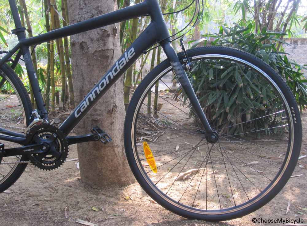 This hybrid bicycle from Cannondale which I test rode came in a full black frame little bit of white graphics for the brand and model logo. The unique line pattern on the forks, seat post and chain stay look new and refreshing. The matte finish paint job is of a superior quality. Like always this Quick 7 has gone with a simplistic design, which has clearly worked to keep the overall outlook neat. Internal cable routing could have been a welcome addition for the price of this bicycle.