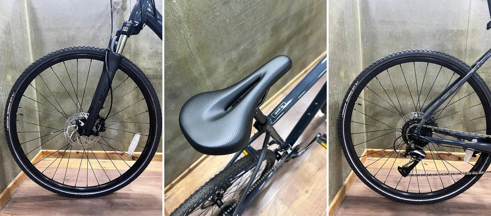The Schwalbe Spicer tires are known for their durability and grip, providing confidence on various road surfaces. The Cannondale Fitness Ergo Double Density saddle offers ample cushioning, ensuring rider comfort even on longer rides.