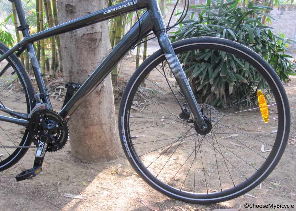The Schwalbe Spicer 7x3C tires has good control characteristics in all weather conditions, which make it the ideal tire for the city. The protective layer on the inside is stronger and safer. But at the same time they managed to make the material much more elastic, which gives a higher level of protection with good rolling resistance.The stock Cannondale Fitness Ergo saddle were ergonomic in shape and helped be sore free for a long time. But the material felt a little slippery with standard cycling clothes. The overall ride quality was fast on urban roads.
