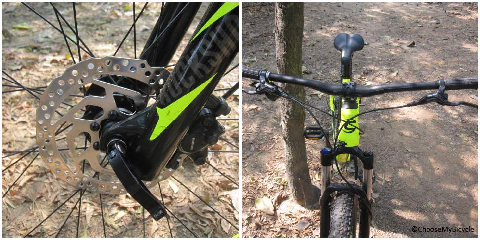 The Trail series have always been top notch with their design. This Trail 4 which I test rode came in a Lime green colour with black graphics. The gloss paint job was superior in quality and really did shine. The internal cable routing for the gear cables make the front of the bicycle look neat. The saddle, rims and suspension fork are colour coded and does increase the aesthetics of this bicycle.