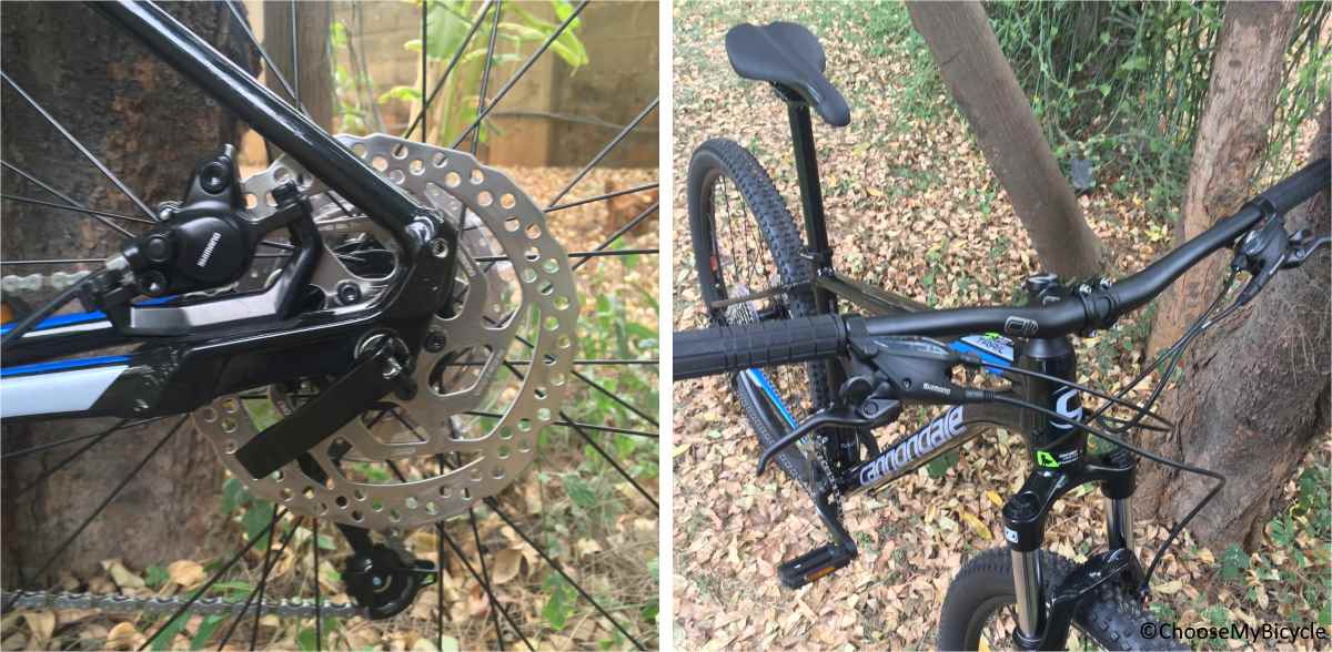 The Trail 7 (2019) is built using Cannondale's famous S.A.V.E built in Suspension tech Alloy frame. This frame has a tapered head tube and smooth welded edges to keep most of the material at places in the frame, which are capable of taking in the vibrations of the trails. The slanting top tube makes the ride geometry aggressive and comfortable as well.The SR Suntour XCM front suspension fork comes with a massive 1mm travel which worked really well on the roughest of trails. The pre-load adjuster helped control the travel according to the weight of the rider and the pressure required.