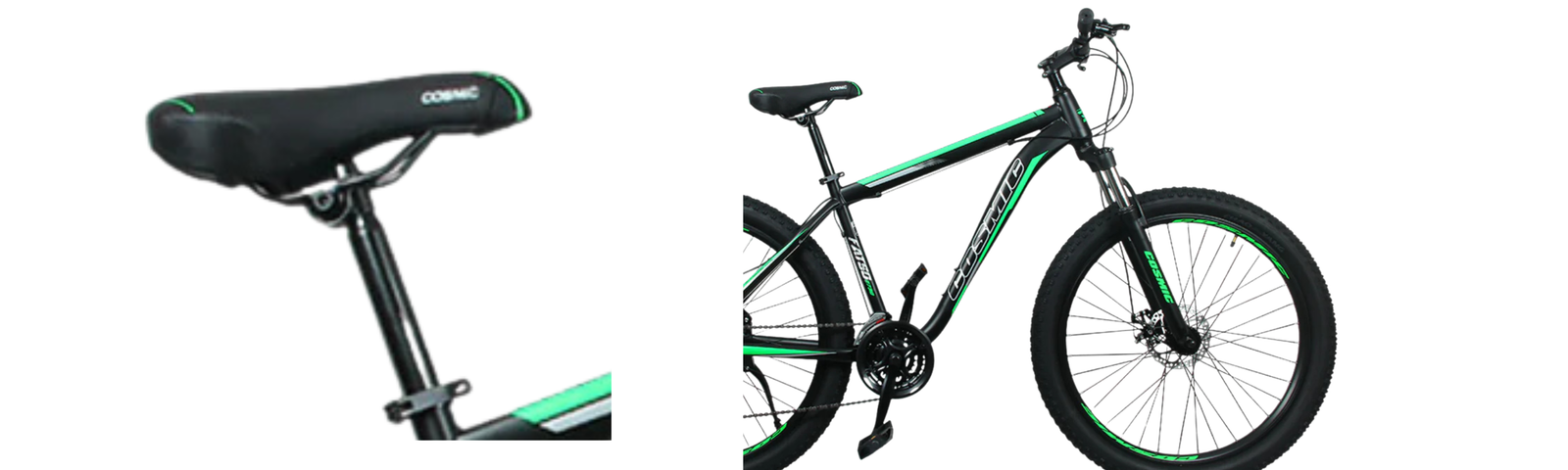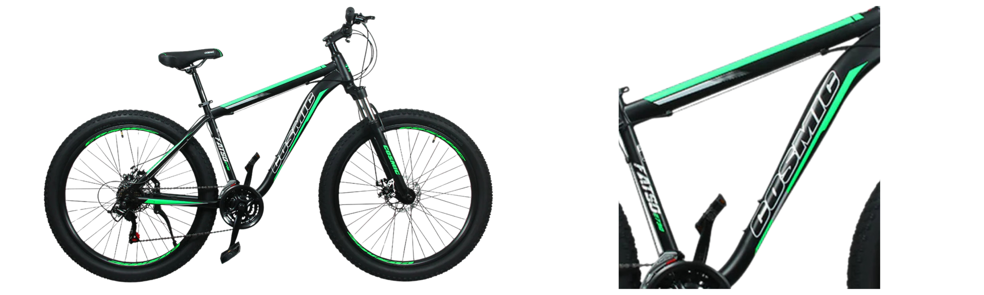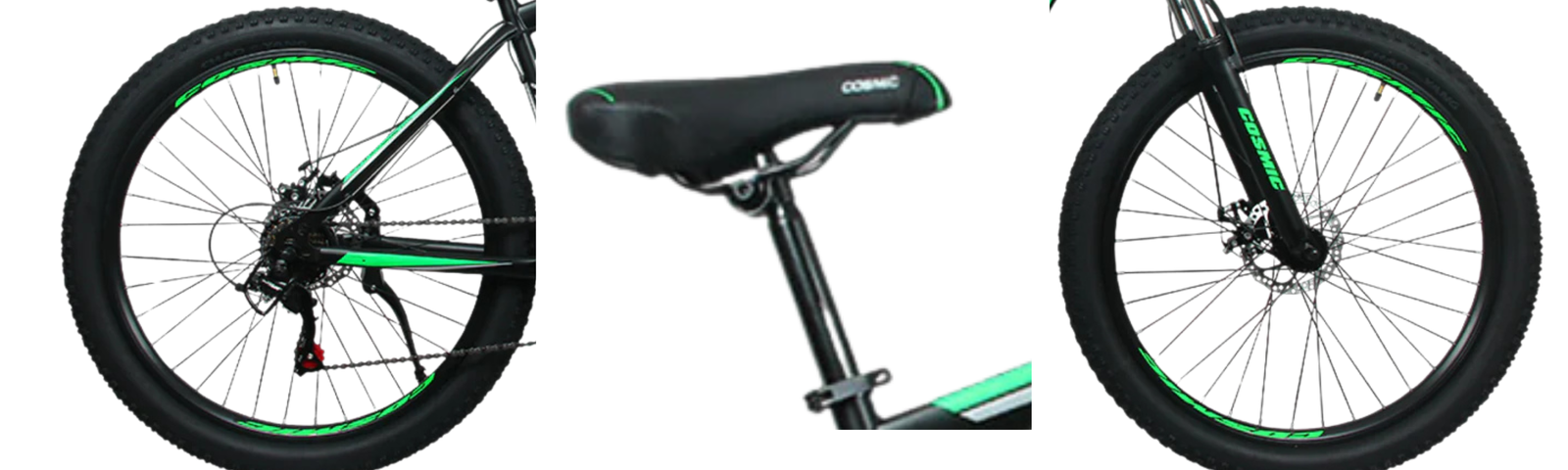 The Cosmic 27.5 FATSO 21-Speed is Cosmic’s rugged all-terrain fat bike built for riders seeking adventure, stability, and bold styling in one package. Designed for comfort on rough tracks, trails, and city rides alike, it pairs a durable steel frame with wide 3-inch tires and a reliable Shimano 21-speed drivetrain.