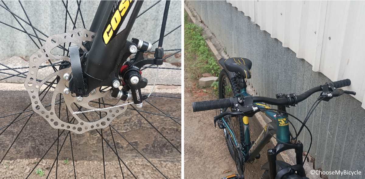 The stopping power on this 29er Hardtail MTB from Cosmic is taken care of by a pair of Tongli branded Mechanical Disc brakes. These brakes were of good quality with rotors and the disc plates which were powerful in stopping amidst traffic and even on flat muddy surfaces.This MTB handlebar with a minimal raise was wide and gave optimum control for the rider when riding through fast paced flat trails and also when maneuvering through sharp turns.