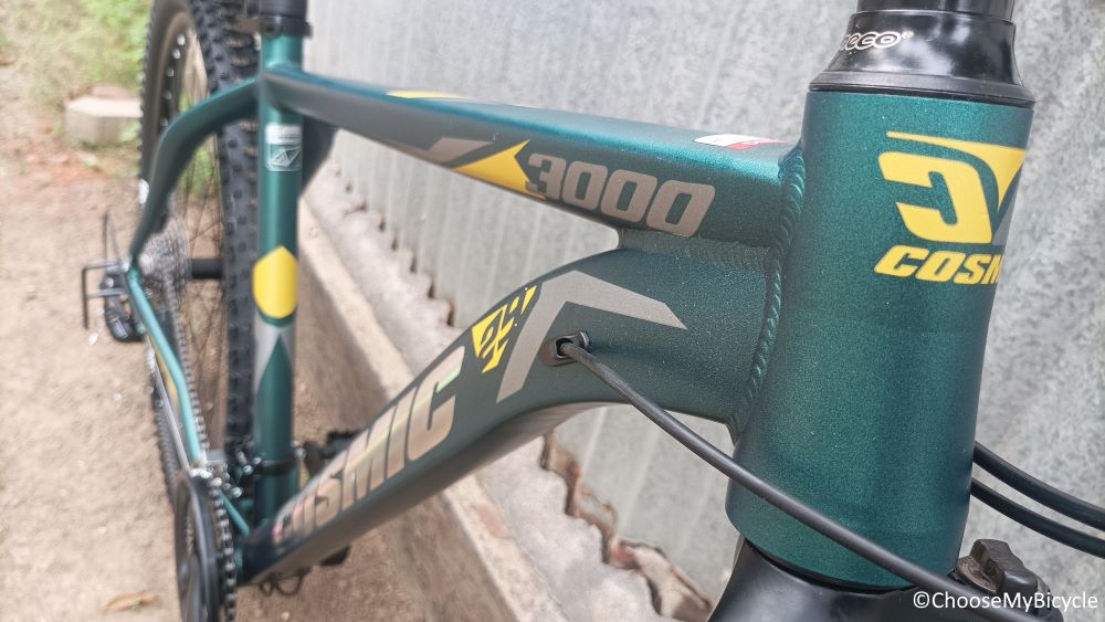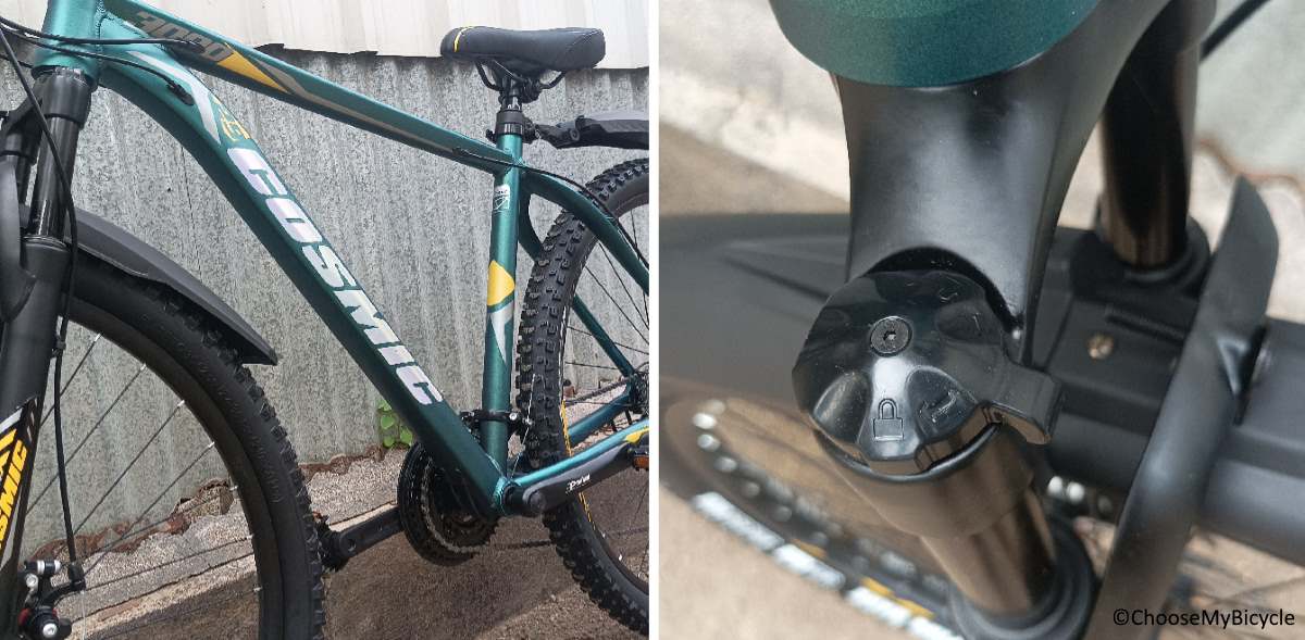 The Cosmic 3 29 is a Hardtail MTB. This frame is built fully using Alloy. This frame comes with a slanting top tube which made it easy to get on and off the Bicycle and also safer for the rider on bumpy rides with the extra standover clearance. The frame geometry ensured the rider was upright with relaxed shoulder and wrist positions for a pain free ride.Being a Hardtail the 3 29 comes with a stock front suspension fork with an 8mm travel and a mechanical lock-out which helps in better acceleration in flatter surfaces