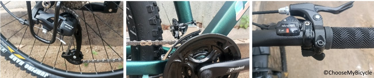 This Bicycle comes with a Microshift Marvo 27-Speed drivetrain and Microshift TS38 shifters