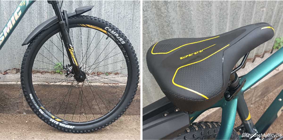 The 3 Cosmic Alloy MTB comes with Compass Jumping Hare 29” x 2.25” MTB tires. These tires have bulky treads and a uniform tread pattern which provided great traction on trails and flat muddy surfaces. This tires were ideal for faster rolling resistance as well as being balanced on flat trails.The stock Saddle from Cosmic wasn’t the most ergonomic in design but had enough cushioning for a soreness free ride.