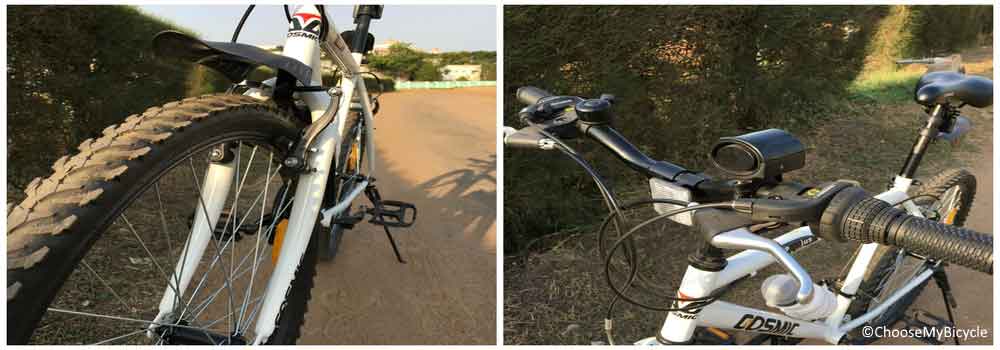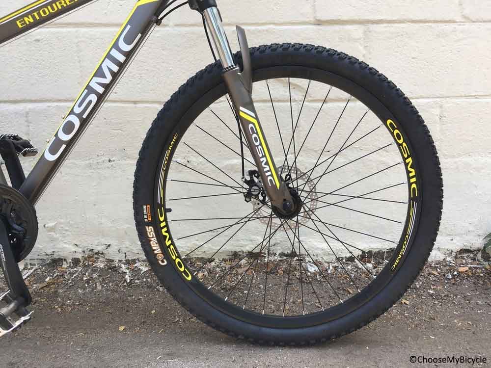 The Cosmic Entourer 27.5 is built on an alloy frame. A 27.5 inch tire sized MTB needs a strong frame to support the bicycle through the rough trails. Cosmic have done a commendable job in making a frame which can handle the beatings of tough trail and helps support the rider with perfect amount of rigidity to absorb some vibrations of the surface.The Entourer 27.5 comes with a pair of front suspension forks which helps get through trails without much difficulty. The travels on these suspension forks are up to 7mm comfortably and worked well during the test ride. The suspension pistons are heavy but that does not add any extra effort while pedaling. The lockout feature in the suspension is a key feature for a bicycle at this price point and will be useful on flat city roads. The suspension forks are entry level and will need constant servicing to keep it functioning smoothly.