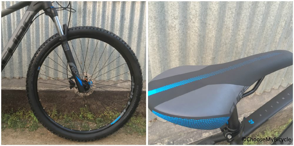 The Schwalbe Smart Sam active 29” x 2.25” was heavily treaded with bulky buttons. The dual compound rubber helped ride through trails without the hassle of smaller punctures. The 29” tires rolled fast and could handle the roughest of trails easily. The Cube Active MTB Saddle was ergonomically designed for fast and bumpy trails rides and also has a colour coded design with a grip patch.