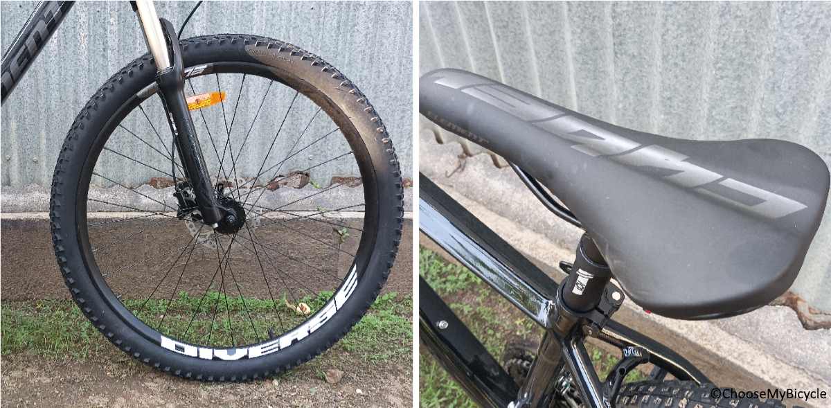 The Stock 27.5” x 2.25” MTB tires on the Cyber Y8 are heavily treaded and are supported by Double Walled Alloy rims. The treads on these tires are massive for 27.5” tire standards, making it generate a lot of traction even on wet trails.The stock foam Saddle from Element was ergonomic in design with the perfect width to keep those sit bones in place.