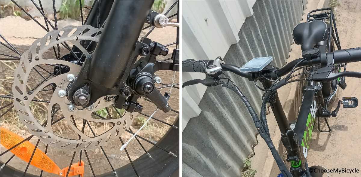This Folding Electric Bicycle is equipped with a simple 1x7-Speed drivetrain. This means there is no front derailleur and the rear has a 7-Speed derailleur. This 7-Speed gear system helps in 2 scenarios; for exercise purposes and also to pedal easily if in case the battery power runs out during a ride. The Shimano shifters were basic and were easy to shift with clear gear indicators.