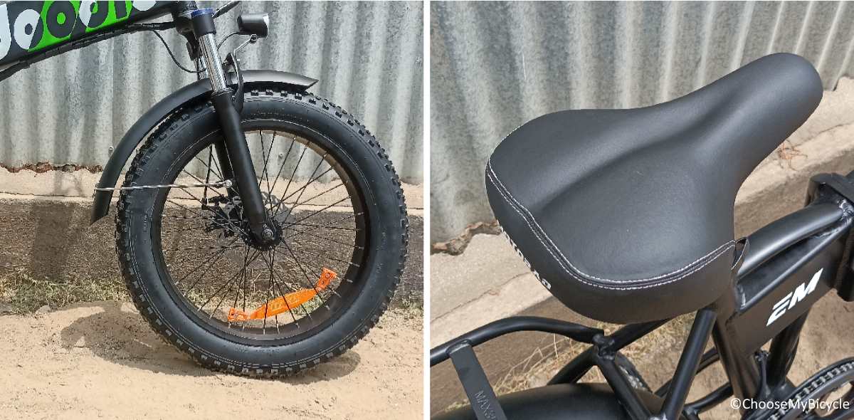 The EMotorad Doddle rolls on a pair of 2” x 4” fat tires. These tires are heavily treaded and fast rolling, making them perfect for rough and smooth roads. These tires are also fixed with stock front and rear metal mudguards for protection from dirt and rain for the rider.The stock saddle from EMotorad was wide and well cushioned to keep the rider sore free when riding on bumpy roads.