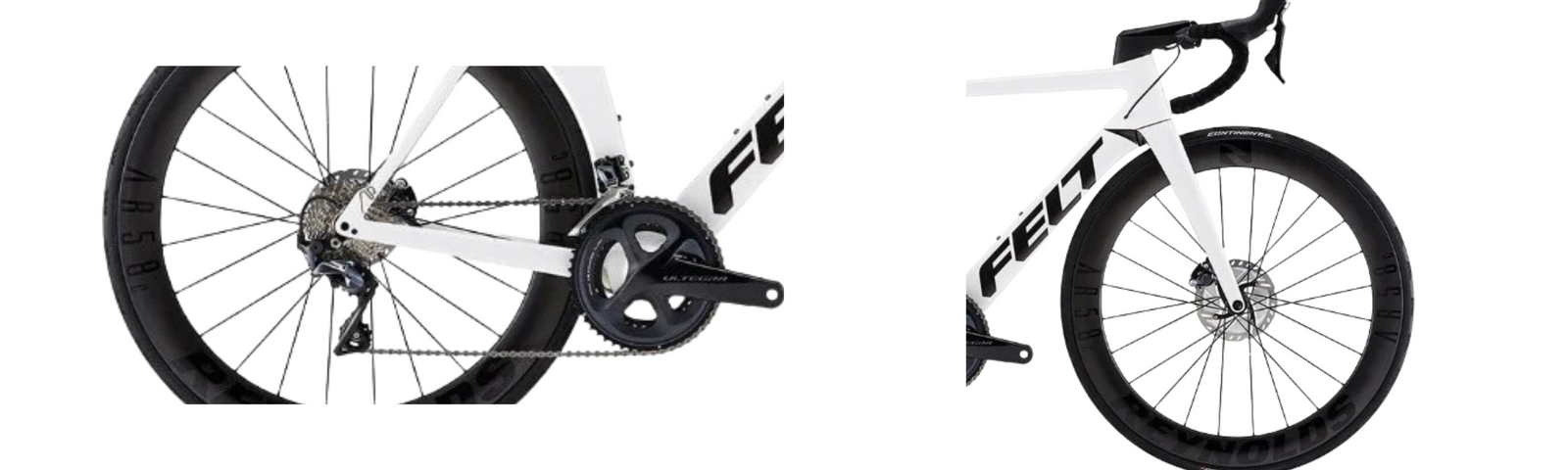 The Ultegra Di2 12-speed electronic groupset is top class just below Dura-Ace: fast, precise shifts, good reliability, and solid chain retention. Felt pairs it with a cassette of 11-30T and a crank of 52/36T (standard race ratios).