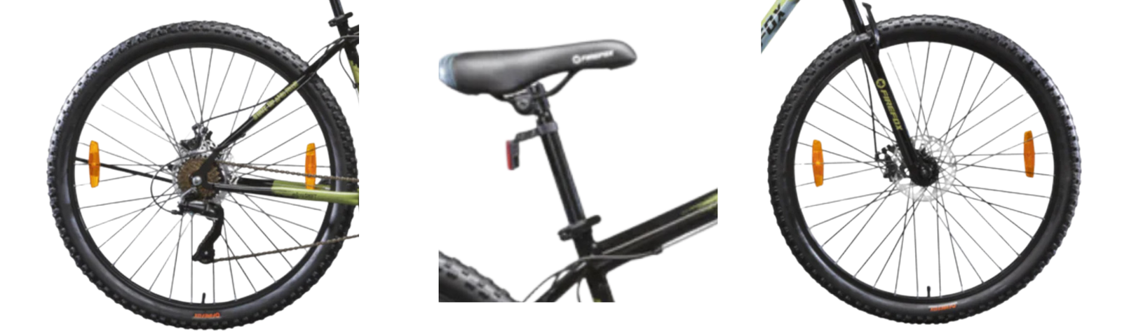 Braking duties are handled by mechanical disc brakes on both front and rear wheels a major plus at this price point. They provide strong and consistent stopping power even on wet or dusty trails, improving rider confidence on downhills or sharp corners.