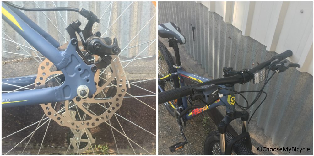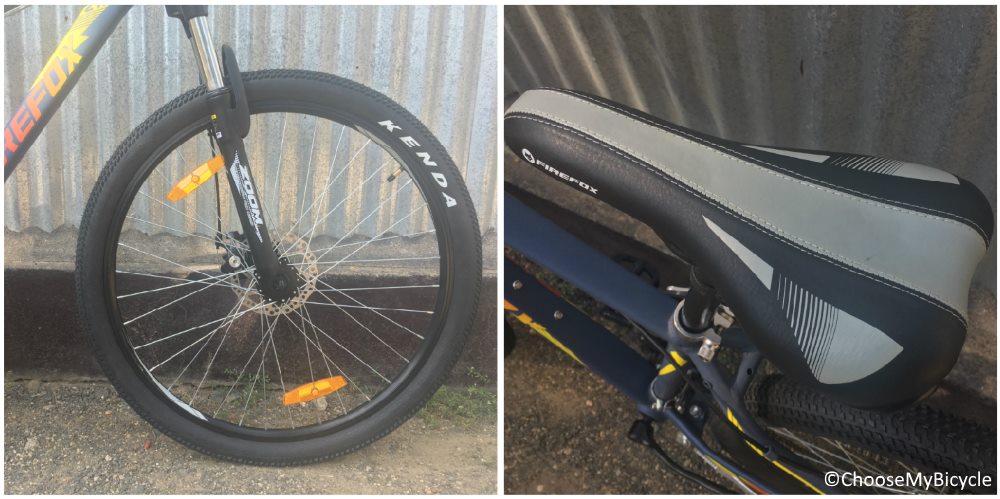 The Kenda 27.5” x 2.125” tires in the Firefox Bronco 27.5D are heavily treaded and this helps in rolling over rough surfaces easily. The treads are spread out in a uniform manner and helps get enough traction even on fast turns. The stock Firefox Saddle was shaped perfectly but could have had slightly more cushioning for better comfort.