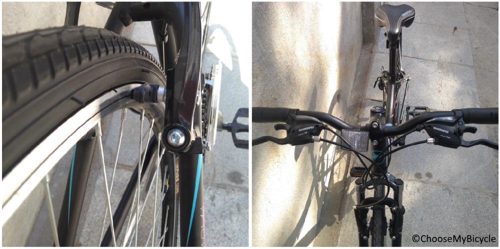 The Firefox Karma comes equipped with 7x35c hybrid tires. These tires were found to be fast rolling, making riding the bicycle on Indian City roads a breeze. The light reading on the tires ensures good grip, making it easier to ride on different road surfaces, and in varied weather conditions. Additionally, the front wheel has a Quick Release Option, allowing for easier removal of the wheel. However, the rear wheel does not have a Quick Release option.The Stock saddle on this bicycle was well cushioned, adding to the overall satisfaction of the ride quality. Furthermore, the saddle has a color coded streak down the center, to match the color on the frame of the bicycle and adds to the overall appeal of the bicycle. The saddle comes with a Quick release option, allowing for easy adjustment of the seat height while on the go.
