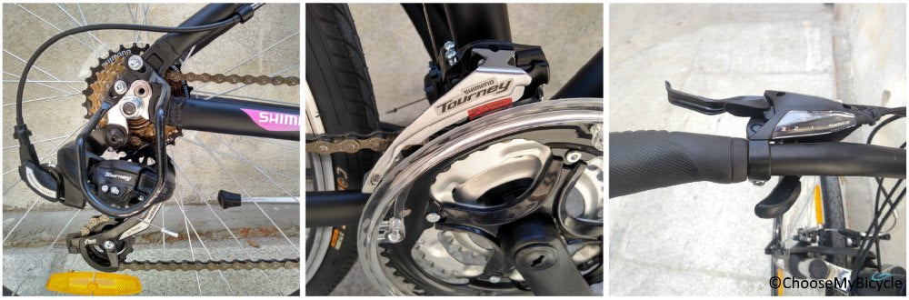 The Firefox Karma comes equipped with Shimano Tourney derailleurs at the front and the back. The shifting is controlled by Shimano EF5 trigger shifters, which are well placed on the handlebar and are accessible with no strain. When on the test ride, the gears shifted with ease, allowing for smooth, seamless shifting, with no delay or lag between the shifts.Note - The Firefox Karma now comes with a Microshift Mezzo 21-Speed drivetrain</I>