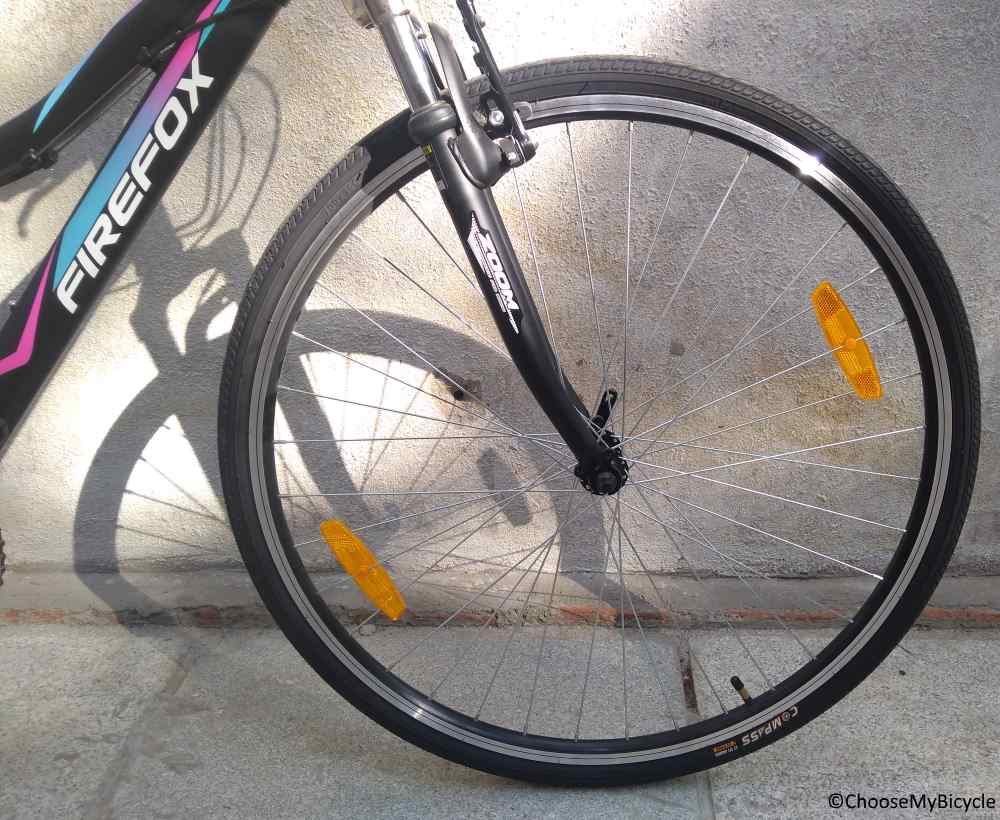 The Firefox Karma has been made using a hybrid alloy frame, which is durable, sturdy and lightweight. The frame geometry has been ergonomically designed to be well-suited to women riders. The downward sloping top tube enables easy mounting and dismounting from the bicycle. The frame has a provision for a bottle holder to be attached to it. The Firefox Karma comes with a Zoom front suspension fork. This suspension fork has 4mm travel, which is the most basic amount of travel one can expect out of a suspension fork. However, given that this is a hybrid bicycle to be used in cities and on longer rides on flat surfaces, the said travel will work fine to absorb shocks felt over potholes and other bumps on rugged city roads.