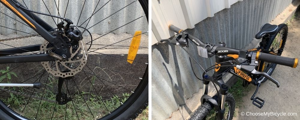 The Tektro mechanical disc brakes at both the front and back worked well during the test ride. The quick reaction and balanced braking makes cornering and sudden stops safe. From Promax disc brakes in the lower end Firefox MTBs to Tektro in the Maximus is quite the upgrade considering the price of this bicycle. The Shimano brake levers were in close reach and can be used with 2/3 fingers.The Zoom alloy 66mm flat handlebar is wide enough to give the rider full control of the bicycle during fast drops. The slight 2mm raise makes the riding posture comfortable.