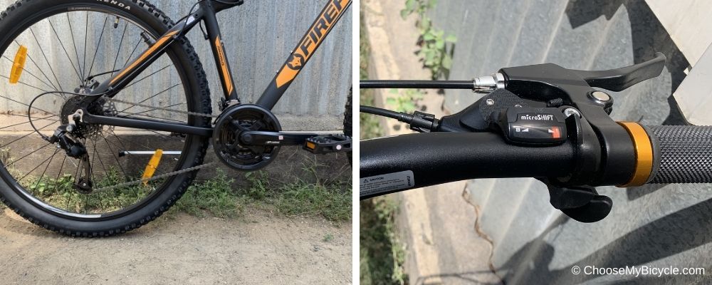 Being a performance focused hardtail MTB it is important for the gears to assist in controlling the speed and acceleration for the rider. The Firefox Maximus D 29er comes equipped with Shimano Tourney / Microshift M2 3-Speed at the front and Shimano Acera M36 / Microshift M26L 8-Speed at the rear.The 3 x 8 (204 speed) drivetrain gives that extra bit of speed needed for those fast paced trail rides. The Shimano EF5 shifters were easy and comfortable to use.Note - The Firefox Maximus D 29er now comes with a Microshift Mezzo 24-Speed drivetrain.</I>
