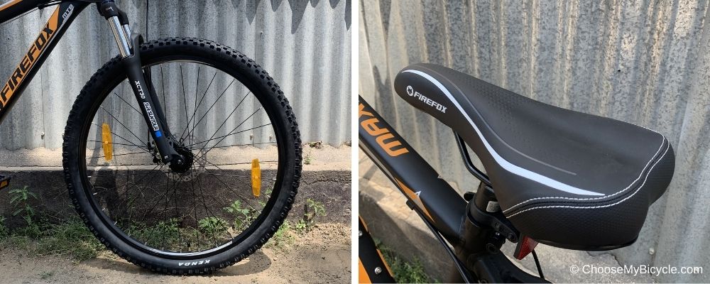 The Kenda 29” x 2.1” MTB tires helped in 2 things: One is the large wheelbase making it easy to roll over rocks on trails and the second is the heavy rubber treads which gave great traction on muddy surfaces. For serious MTB riders looking to race on trails, going tubeless could be a decent upgrade. The stock saddle on the Firefox Maximus had enough cushioning where it is most needed but an ergonomic design would have made the saddle even more comfortable. The overall ride quality was comfortable on muddy trails.