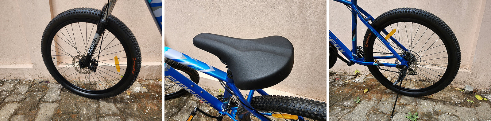 The bike features reliable mechanical disk brakes on both front and rear sides, ensuring effective braking in all conditions. The wide handlebar promotes an upright riding posture, reducing strain and enhancing control. The handle grips, made from a soft, durable material, provide a comfortable and secure grip. The steering is smooth and responsive, making the bike easy to maneuver. Overall, the braking and steering systems prioritize safety, comfort, and control, suitable for both novice and experienced riders.