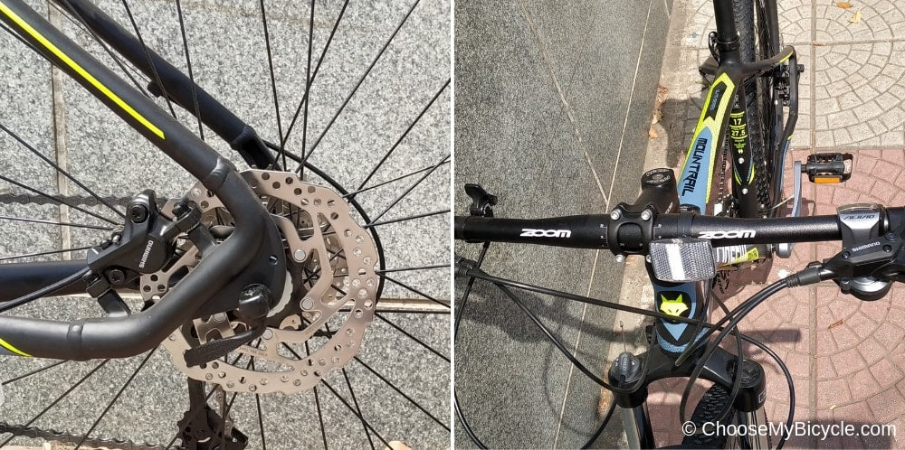 The Firefox Mountrail comes equipped Shimano Acera Hydraulic Disc brakes. When tested, the braking was found to be powerful and efficient. Both power braking and progressive, feathered braking felt stable and balanced, even when on sand/ loose gravel. It is safe to say that these brakes will perform with efficiency and precision on dry and wet surfaces alike. This bicycle comes equipped with a Zoom Alloy 69mm wide handlebar. The handlebar is on the longer side to allow superior balance and control of the bicycle when riding on harsh trails. The grips on the handlebar were comfortable and ideal for usage on harsh terrains.