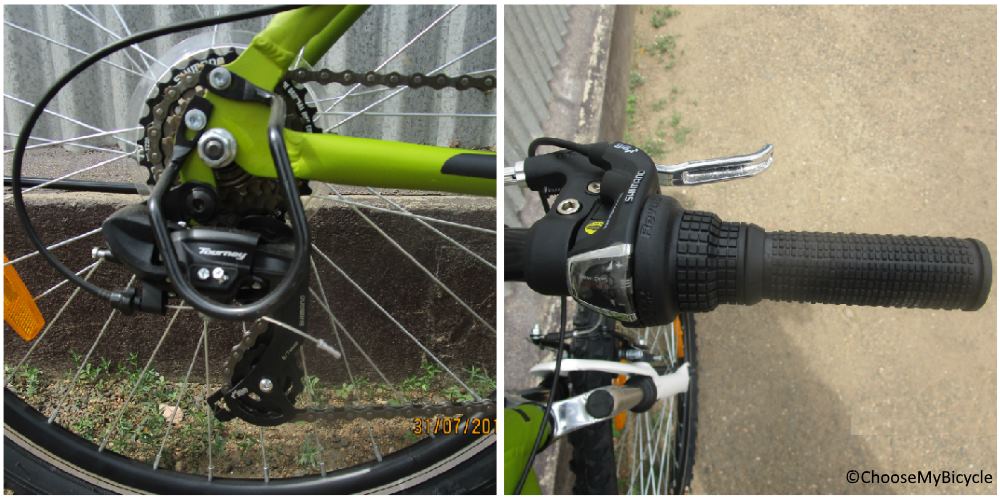 The Patrol 6S that I test rode came with 6-Speed rear derailleur. This Shimano gearing is the most entry level as it can get on a geared bicycle. The 6-Speed drivetrain is just enough for urban commuting and flat trail rides. But with a 6-Speed there is a limit to speed gains and climbing on flyovers but for short rides it is ideal. The Revo shifters are old school but they worked well without any difficulty. A 21-Speed drivetrain would have been ideal for a better ride quality.