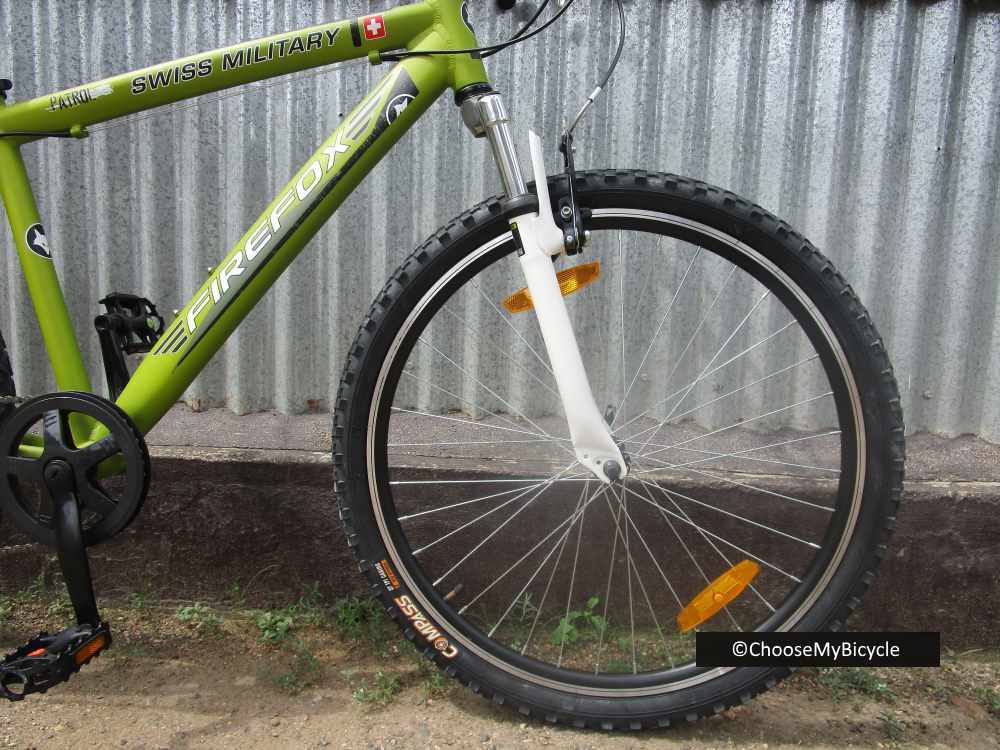 This bicycle which I test rode came in a full Olive Green colour with White graphics. The matte finish paint job quality is smooth and has nice finish to it. The ‘Swiss Military’ text graphics and logo on the top tube is new and refreshing. The welding on the frame is neat and the geometry is simple yet perfect. The white suspension fork adds a nice contrast to the olive green frame.