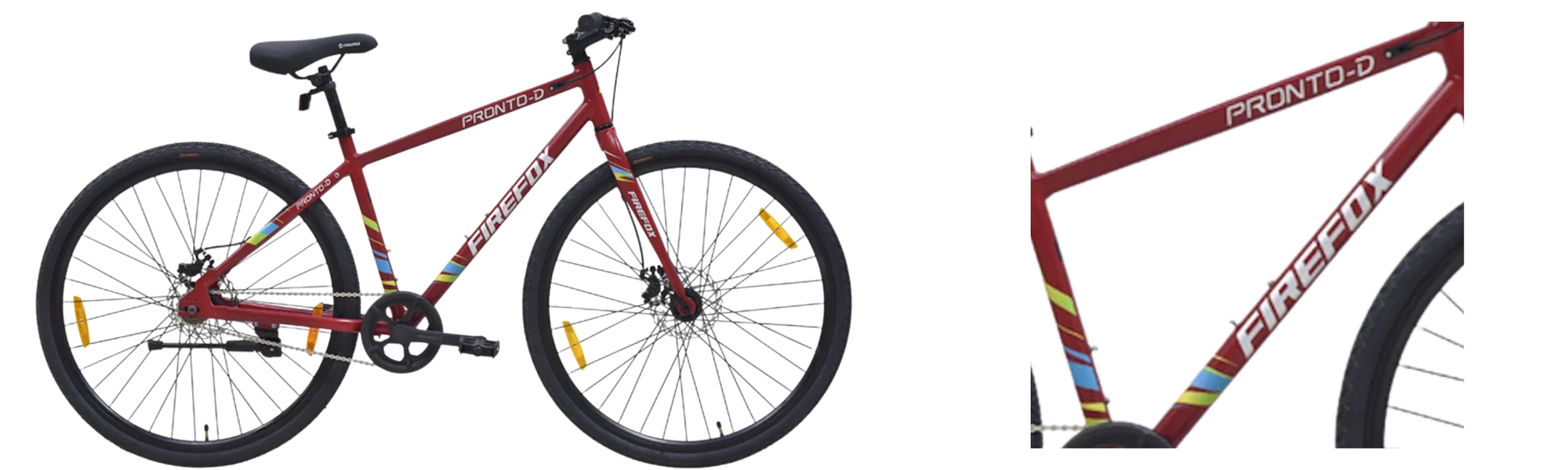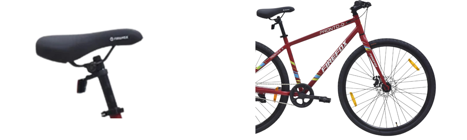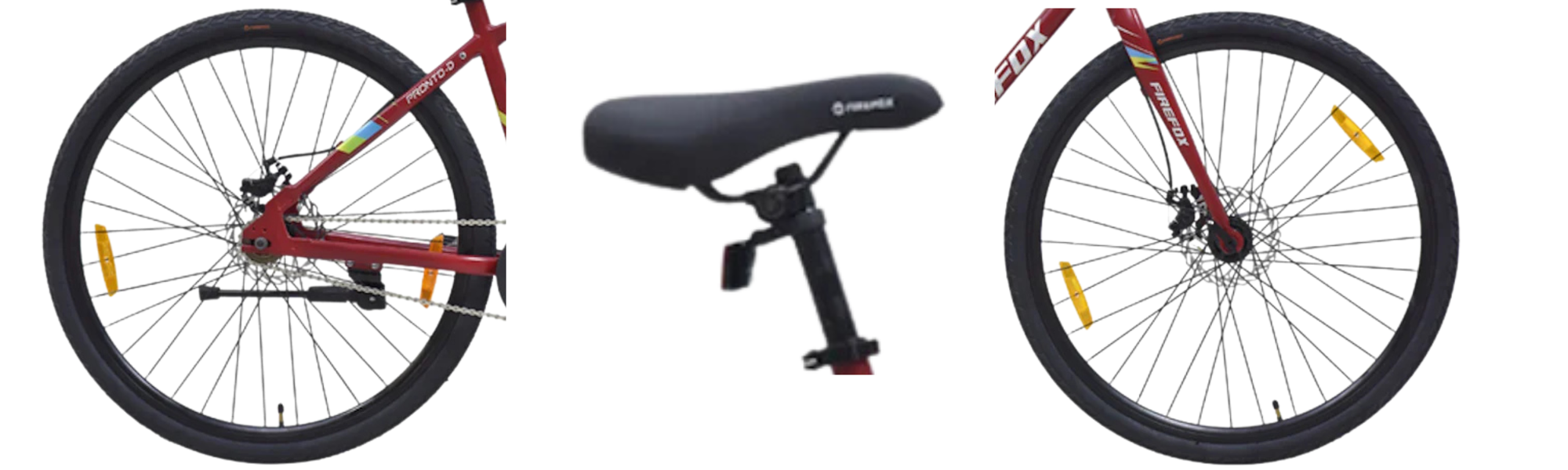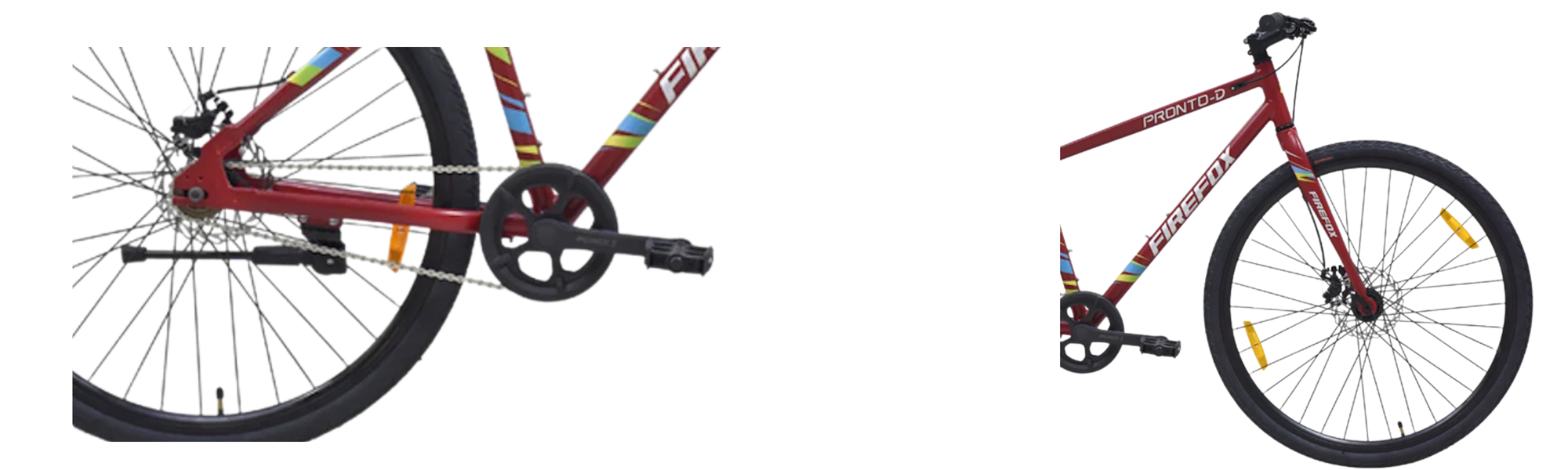The tyres are around 700 × 35c (approx) offering a comfortable compromise between rolling efficiency and bump absorption. The saddle is described as “comfortable” with Firefox artwork in the specs, so while not a high-end ergonomic saddle, it works well for everyday use. On commutes and moderate rides the wheel/tyre combo performs well—stable, firm, with decent rolling speed and enough grip for urban surfaces. On rougher non-paved paths you may feel the limitations of the rigid fork and fixed gear.