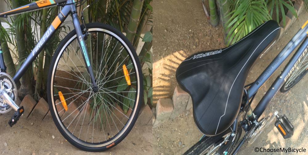 The Rapide 21s rolls on a pair of 7x35C tires that are fixed on to double walled Alloy rims. The treading and size of the tire were ideal for city commuting and long rides. The rolling resistance was fast and the tread pattern provided enough traction on wet roads as well. The stock Firefox saddle might look a bit old-school but it has the perfect amount of cushioning to keep the rider sore free on long rides.