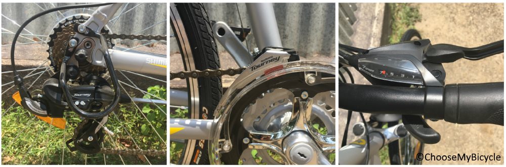This bicycle is a performance focused hybrid for both commuting and long distance fitness rides. Firefox have gone with Shimano Tourney / Microshift Mezzo at the front and rear as derailleurs. These gears performed well during the test ride with no lag experienced. The Disc version of this bicycle comes with Acera at the rear but at a higher price. The Shimano EF5 / Microshift TS38 21-Speed trigger gear shifters were easy to operate.Note: The Firefox Road Runner Pro V currently comes with a Microshift M22 3-Speed Front Derailleur, a Microshift M21l 7-Speed rear derailleur and Microshift TS38 shifters.</i>