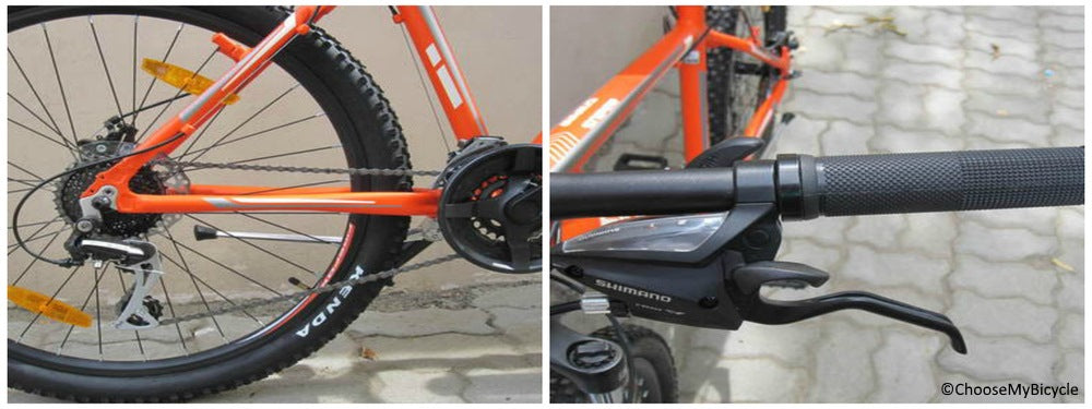 The Sniper D (2017) has its speed powered by a pair of Shimano MTB derailleurs. The Shimano Tourney at the front and Shimano Acera M36 at the back makes for a decent mix up of derailleur components on this hardtail MTB. Mix and match of derailleurs are common on MTB's and I must say that this combination worked without any glitches during the test ride. The gear changes are taken care of by the Shimano EF5 24 speed shifters. These shifters have a big number console making it easy for the rider to see on what gear the derailleurs are on.