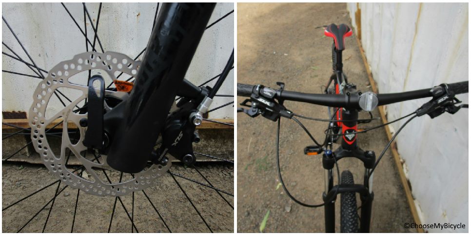 The Shimano SLX M7 Hydraulic Disc brakes handled the braking performance on the Soulfly 27.5”. These Hydraulic Disc brakes are a powerful set of components and can bring you to a halt or slow you down at a controlled manner. Braking on wet conditions and muddy surfaces felt safe without much drag. These brakes are on par with other high performance MTB's and thus making them immensely effective on all weather conditions.The Zoom Alloy 68mm handlebar was flat and wide enough to give the rider superior control over the bicycle. The handlebar could have definitely had better grips with an ergonomic shape as well. The lack of this caused the rider to feel more vibration of the surface, which on a longer ride on rough trails might end up causing fatigue.