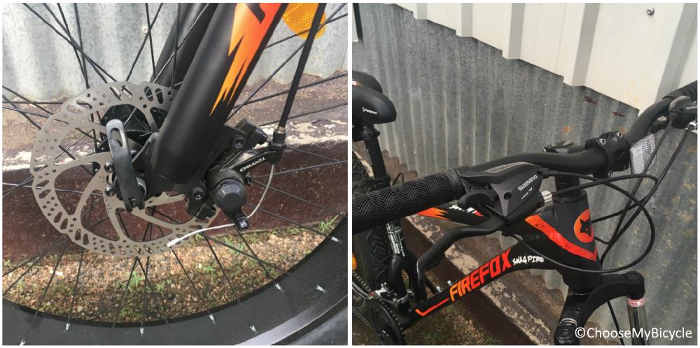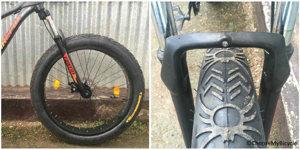 This fat bike which I test rode came in a full matte black coloured frame with orange and yellow graphics. To go with the name of the bicycle, the orange and yellow combine nicely as a design to bring out a fire inspired design. The seat tube has a unique dual tube design when it joins the bottom bracket, which looks good and makes the bicycle look big. The fat tires has an artistic tread pattern design.