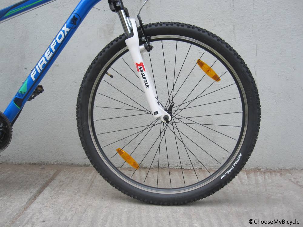 The bicycle which I test rode came in a full blue frame with white and green graphics. The gloss paint job quality was top notch and makes the frame sparkle. This frame's tubes are designed in a way to look sleek and this enhances the aesthetics of the frame. The white suspension fork is a good contrast in colour to the blue frame. The brand and model names are mentioned in a bold and clear manner.