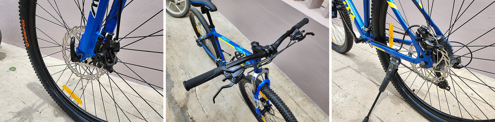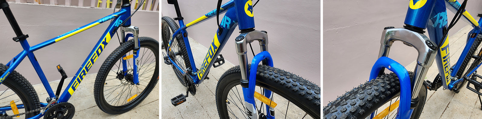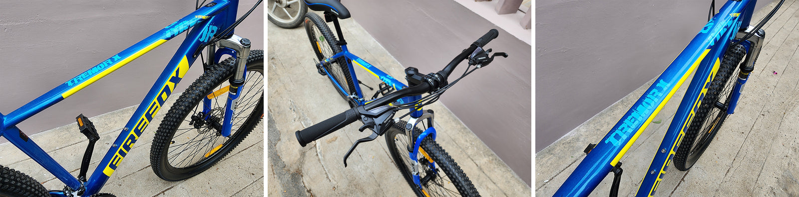 The Firefox Tremor X 27.5 D showcases a striking blue frame contrasted with black tyres, handlebar, and seat. The bright blue color and yellow branding stickers make it stand out, ensuring it catches attention on the roads. The design goes beyond aesthetics, considering rider comfort and convenience. The bicycle's design reflects its performance - bold and robust. It's a stylish yet functional choice for any bicycle enthusiast.