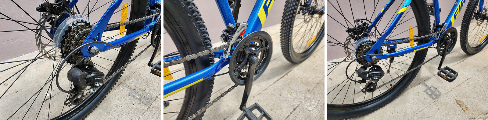 The Firefox Tremor X 27.5 D features a Shimano gearing system with 21 speeds, providing a range of options for various terrains. The rear shifting is smooth, ensuring efficient pedaling. The front shifting is slightly laggy, requiring more effort to shift gears. Despite this, the overall gearing system is robust and versatile, making it suitable for both beginners and experienced cyclists. It's designed to handle diverse conditions, enhancing the bicycle's adaptability.